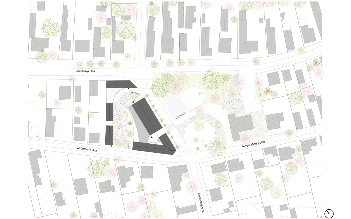 The goal was to create an intimate community courtyard - newly built and old buildings intertwine and generate a perforated frame in the urban fabric. The proposed model also follows the traditions of Hungarian rural architecture, where the main and service buildings are organized around a courtyard.