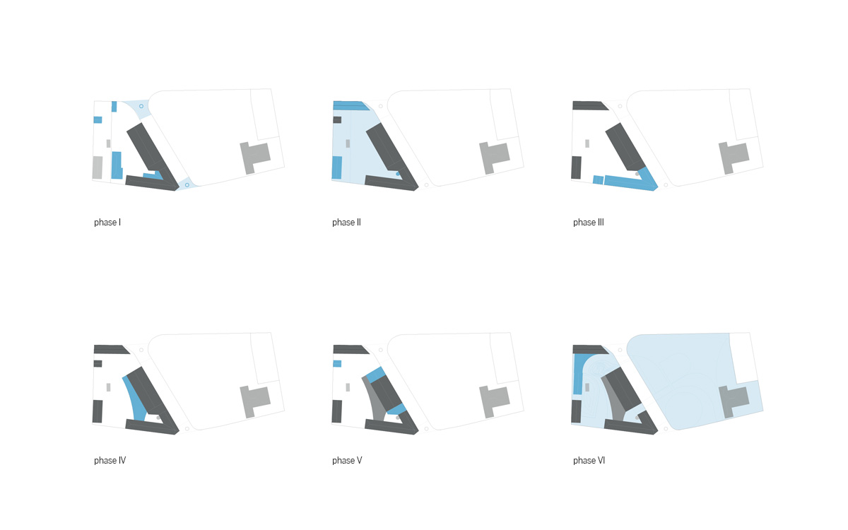 The existing buildings are painted white and all their original ornaments are to be reconstructed. The new parts and extensions are cladded with deep-toned dark brown bricks to create a homogeneous, monolithic surface which also serves as a frame or background to the old buildings.
