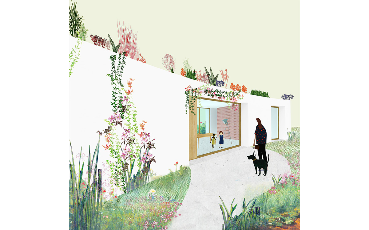 The street view shows a tiny house: it is the narrowest part of the 100 m2 volume that stretches into the front garden. The building curves towards the back of the plot from here, hiding the back garden to create a more intimate space. The gently curved exterior walls provide the intense green areas of the garden with a continuous, homogeneous background.