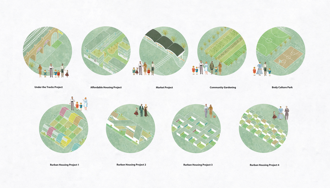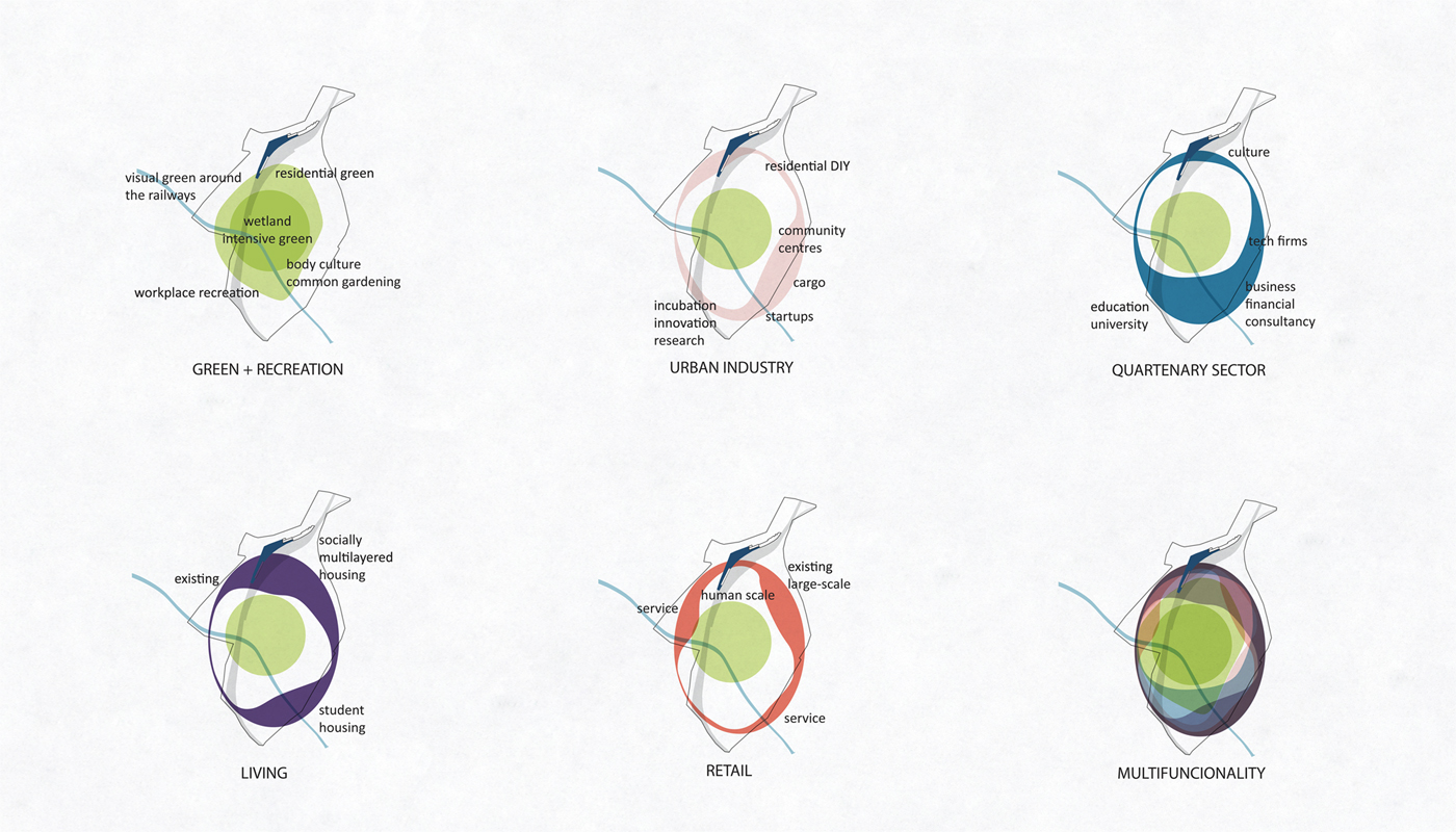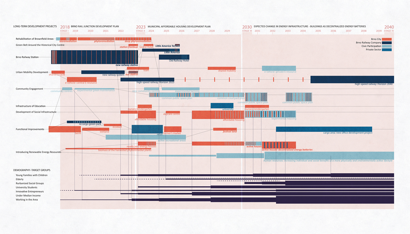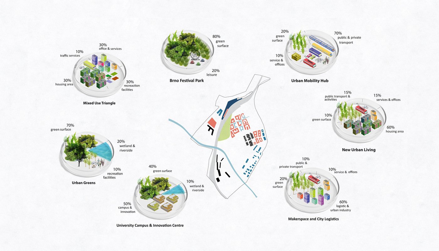 Following a vision of living, compact neighbourhood providing a variety of housing and adjoining services the plan sets out a structural and functional framework for a living urban organism to gradually follow this DNA similarly as the other neighbourhoods adjoining Brno’s central core have developed through the centuries.
