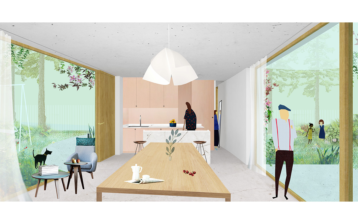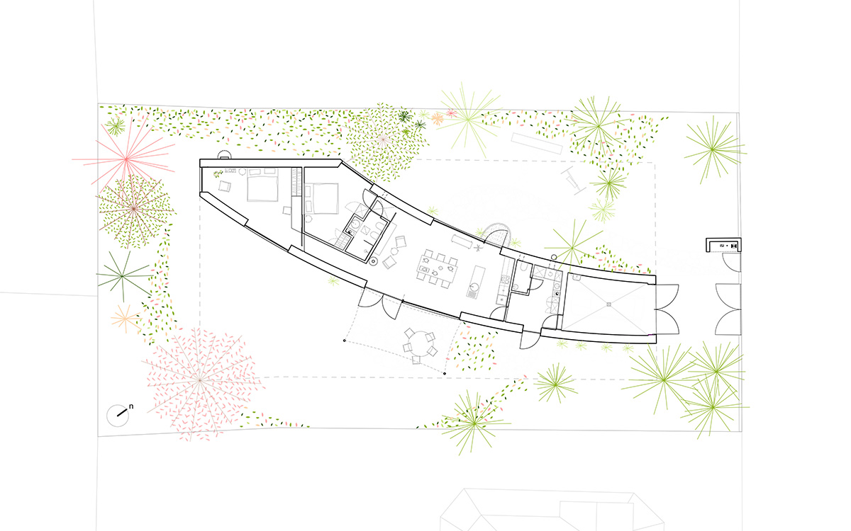 The street view shows a tiny house: it is the narrowest part of the 100 m2 volume that stretches into the front garden. The building curves towards the back of the plot from here, hiding the back garden to create a more intimate space. The gently curved exterior walls provide the intense green areas of the garden with a continuous, homogeneous background.
