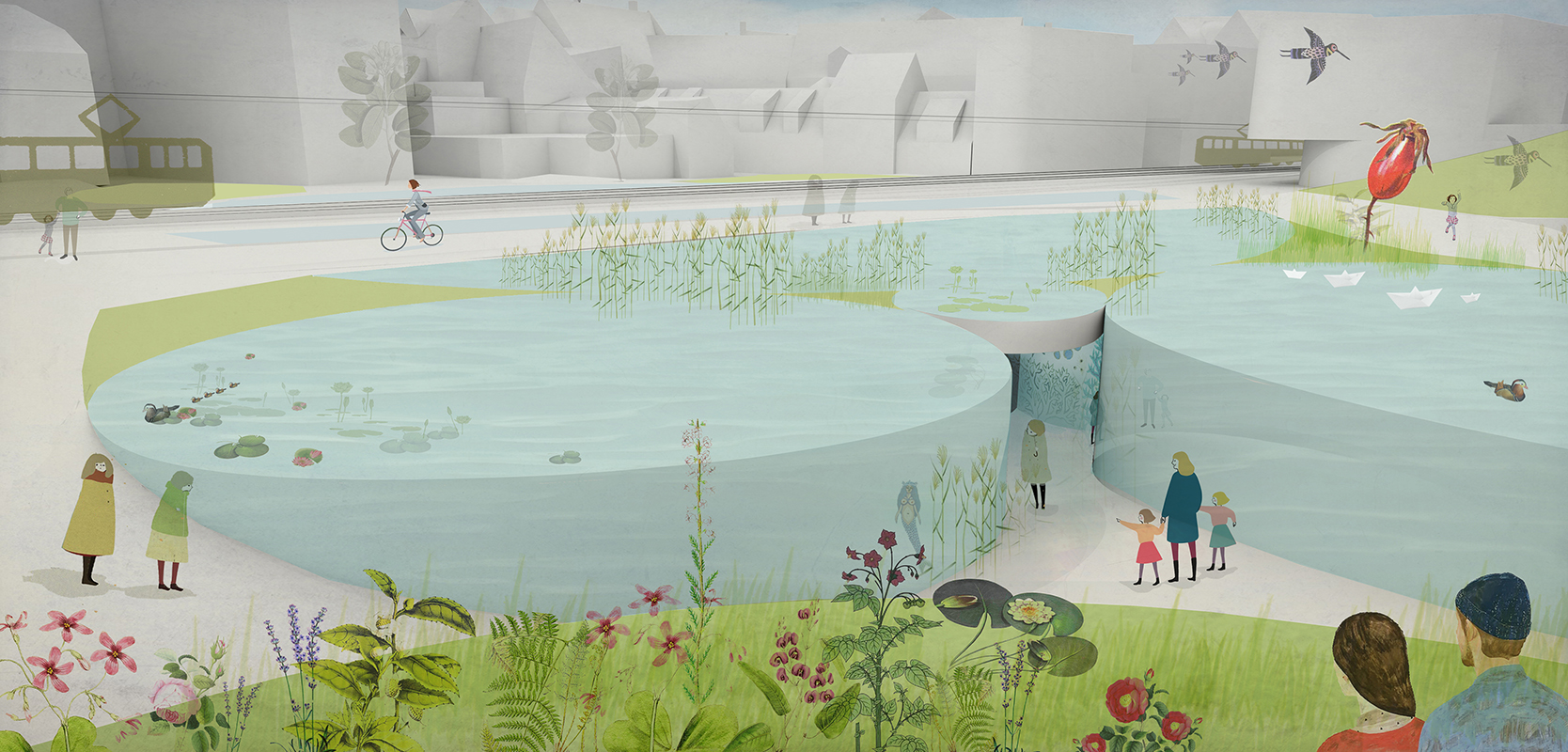 The master plan is defined as geometric concept based on H.C. Andersen’s papercuts, in which shperical shapes subtly integrate the light railway, the gardens and the exhibition facilities.