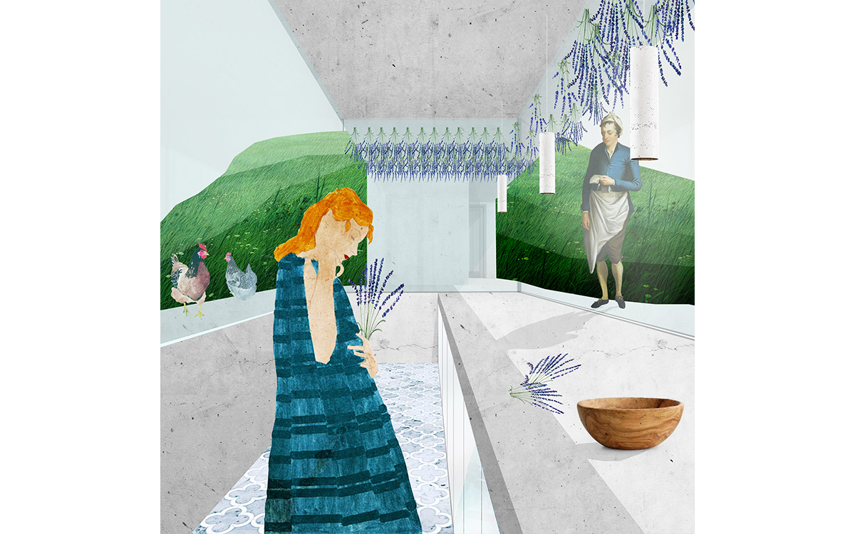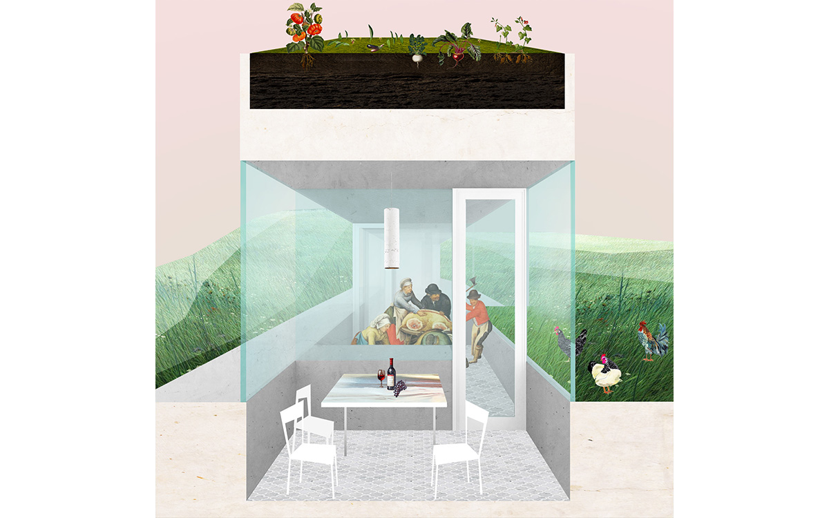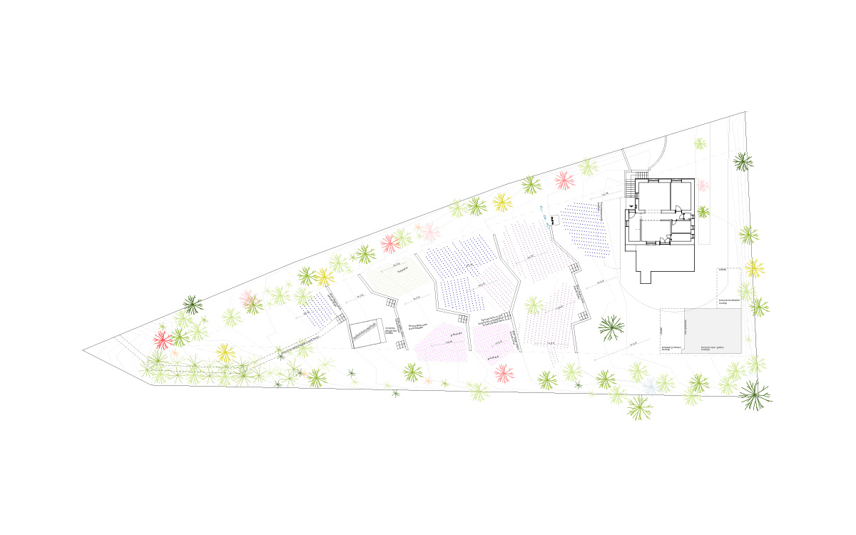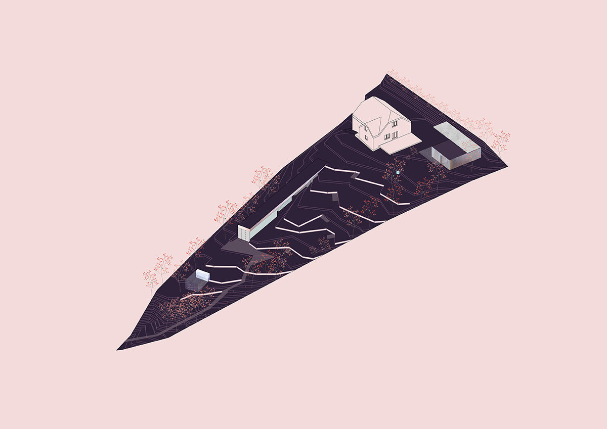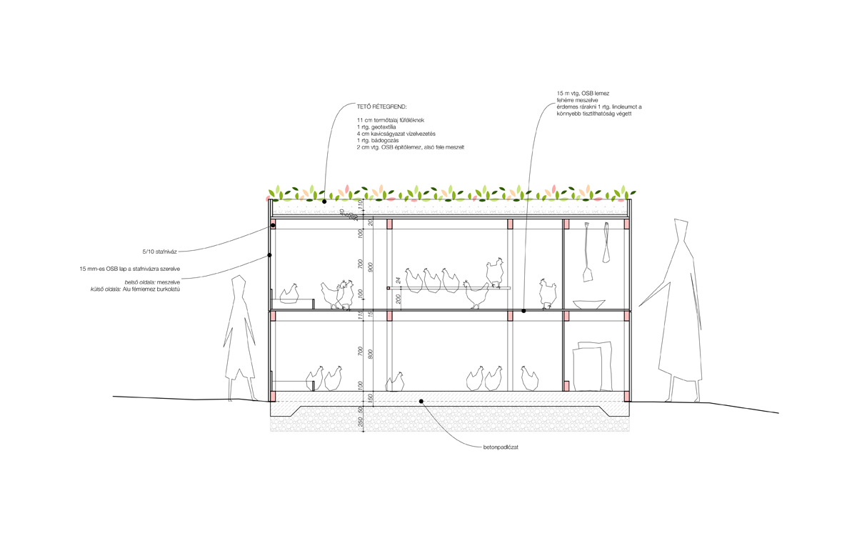 A set of semi-recessed buildings on a Transdanubian slope, serving the needs of a rural family: a lavender dryer building, a summer kitchen and a small but luxurious chicken coop.