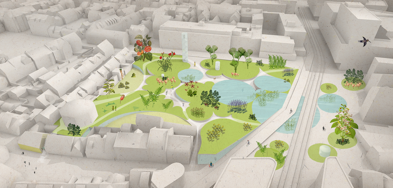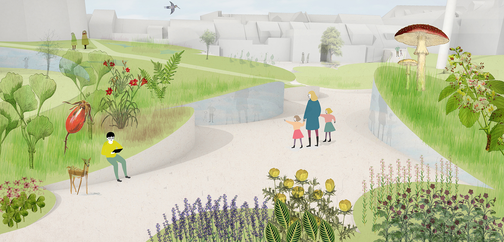 The master plan is defined as geometric concept based on H.C. Andersen’s papercuts, in which shperical shapes subtly integrate the light railway, the gardens and the exhibition facilities.