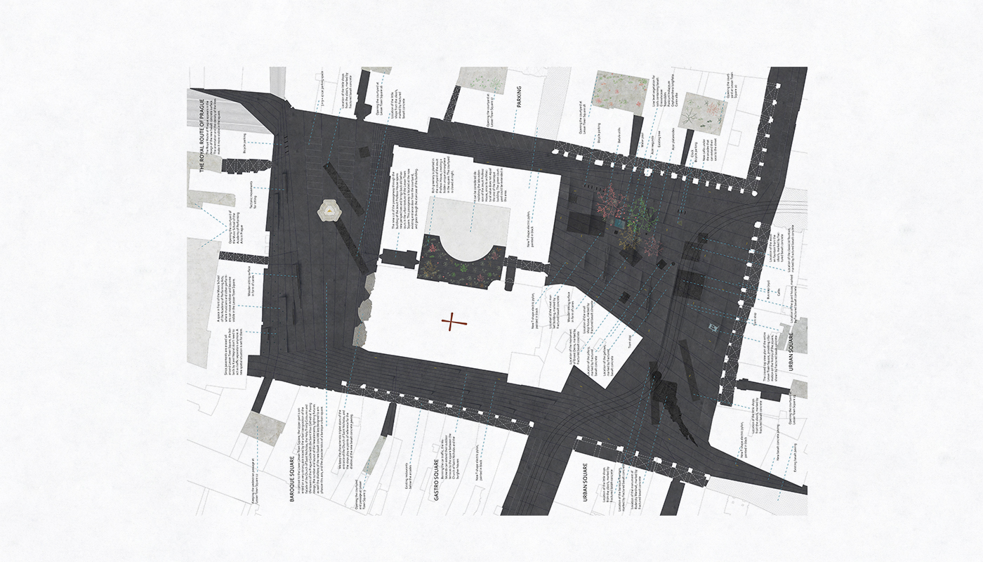 The now giant city parking lot once served as an important royal and clerical urban space, which layers are now absent in the area. This project treats this absence as a key factor in the design and explores the potentials of a human scale urban redevelopment, focusing on the needs of the pedestrian users.